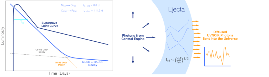 Acontece que o níquel-56 é um isótopo extremamente radioativo. Possuindo um período de radioatividade de cerca de 9 dias, e liberando durante o decaimento radioativo cerca de 1 kilojoule de energia de radiação gama (ou raio-gama) por grama por segundo. O equivalente a metade da energia armazenada em uma bateria AA! O níquel-56 decai radioativamente e torna-se cobalto-56, o qual também é radioativo! Este libera a mesma quantidade de energia e possui um período de radioatividade um tanto maior, cerca de 111 dias. O cobalto-56 por fim decai para o ferro-56, que é estável. Durante vários meses após a explosão, essa cadeia de decaimento expele fótons de alta energia diretamente do centro da explosão (Veja a linha azul claro no painel esquerdo da Figura 2). Entretanto, essa luminosidade não é necessariamente o que vemos. Os fótons de alta energia que são emitidos do centro irão lentamente se difundir (passeio aleatório, veja o painel direito da Figura 2) através da densa ejecta produzida pela estrela ao explodir. Então, antes de chegarmos a ver ou detectar a curva de luz de uma supernova, os fótons devem atravessar essa espessa camada de ejecta, isso significa que o que vemos é uma curva de luz suavizada e difundida (veja a linha azul escura no painel direito da Figura 2). Essa difusão é a razão da típica elevação e pico das curvas de luz das supernovas.