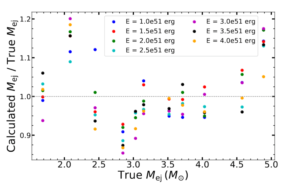 O artigo de hoje discute esse fenômeno e busca conectar o declive do estágio final da curva de luz das supernovas a massa da ejecta. A medida que a ejecta afina, menos fótons de alta energia emitidos pelo decaimento radioativo são absorvidos por ela, permitindo assim que estes “vazem” para fora. Não é possível detectar a luz desses fótons de alta energia, pois eles nunca tiveram a chance de serem difundidos pela ejecta e convertidos em luz óptica. Ao medir o declínio do estágio final da curva de luz de uma supernova, pode-se entender em que velocidade a ejecta está afinando. Mais especificamente, o declive pode nos dizer mais sobre as propriedades da ejecta! Os autores do artigo de hoje utilizaram isso para conectar o declive da curva de luz a massa da ejecta. Eles simularam varias explosões com diferentes massas de ejecta e energias de explosão, e descobriram que esse método alcança cerca de 20% da massa de uma ejecta real. Utilizando essas simulações em uma gama de massas e energias de explosão, os autores conseguiram praticamente prever a massa da ejecta (Veja a Figura 3)