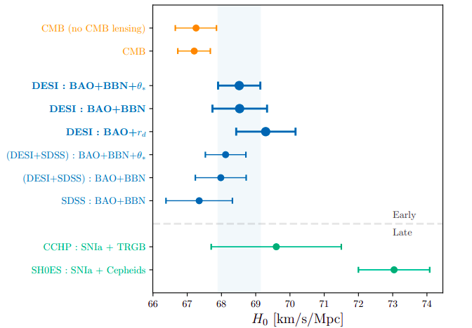 Com as análises do DESI (em azul), os resultados não estão tão próximos de CMB quanto os do antigo levantamento espectroscópico de referência o Sloan Digital Sky Sruvey (SDSS). Pelo contrário, para obter uma melhor aproximação com CMB é preciso combinar parâmetros cosmológicos obtidos pelo Planck.