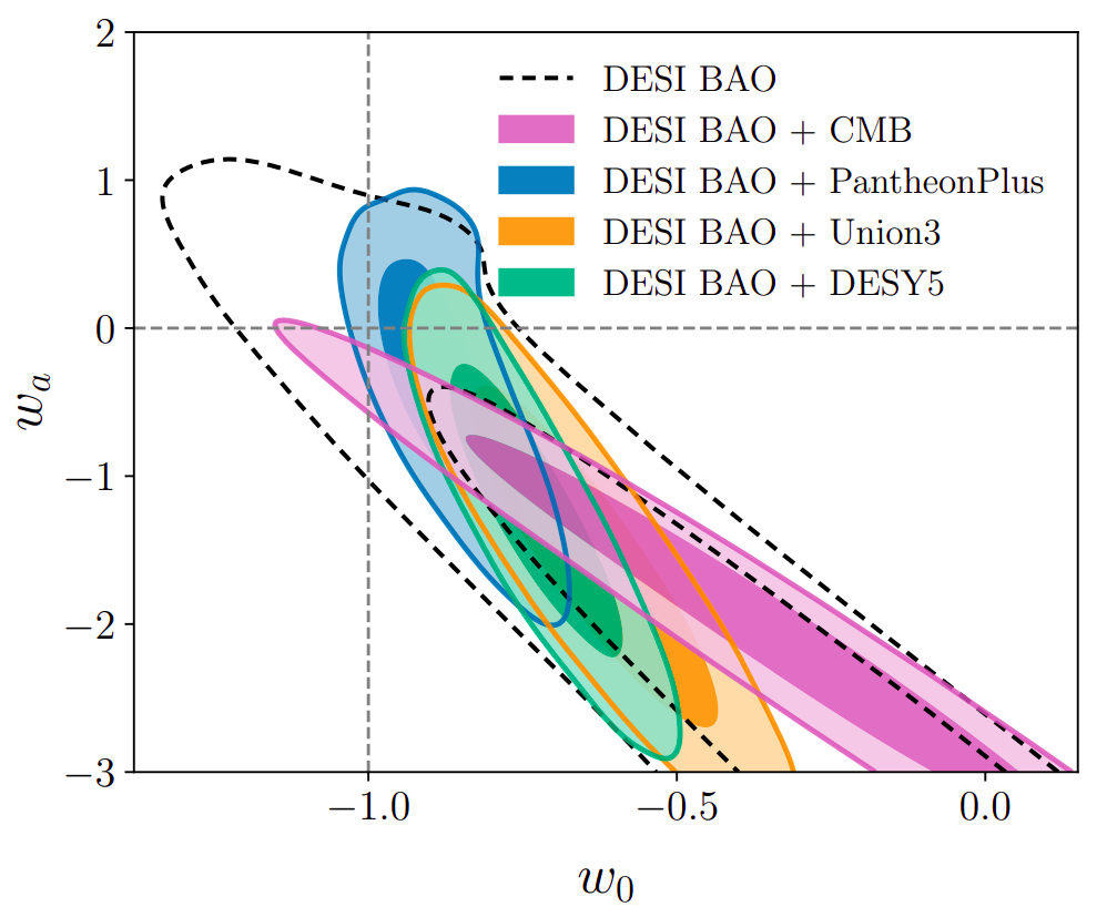 Os resultados obtidos pela colaboração favorecem w0>-1 e wa<0. Isso é mostrado na Figura 2, os contornos são nada mais nada menos que as incertezas de cada parâmetro. O valor exato seria um pontinho, mas como não é possível ter valor exato de nada na natureza, isso vira uma elipse. Ela pode ser larga num dos semi-eixos e estreita no outro. Aqui, o que vemos é que dependendo de qual observável é combinado essa elipse fica mais comprida e mais deslocada para w0 positivo, claramente um desacordo com o Lambda CDM.