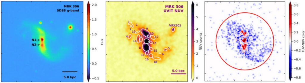 Cientistas da Índia, Noruega e Espanha colaboraram para utilizar o primeiro observatório astronômico baseado no espaço da Índia, o AstroSat, para observar galáxias com núcleos duplos no comprimento de onda ultravioleta (UV). Dado o foco do estudo no monitoramento da atividade de formação estelar nestes sistemas em fusão, a seleção da luz ultravioleta é ideal, considerando que estrelas massivas emitem uma porção significativa da sua radiação nesta gama de comprimentos de onda, queimando a temperaturas quase duas vezes superiores às do nosso Sol.