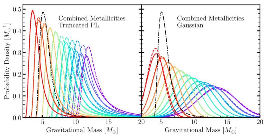 Quaisquer estrelas que não explodem ou deixam uma estrela de nêutrons para trás irão colapsar para um buraco negro. Os autores determinaram a distribuição de massa desses buracos negros baseados em seu critério de explodabilidade supondo que alguma fração do envelope de hidrogênio é ejetado e o material restante cai para dentro do buraco negro recém nascido. Eles permitem que essa fração varie e constroem distribuições de massas baseadas ambas em uma lei de potência truncada e em uma distribuição gaussiana. Assim, eles podem comparar seus resultados com os da distribuição de massas dos buracos negros obtidas pelas colaborações LIGO, Virgo e KABRA (LVK) via ondas gravitacionais. Isso é ilustrado na Figura 4.