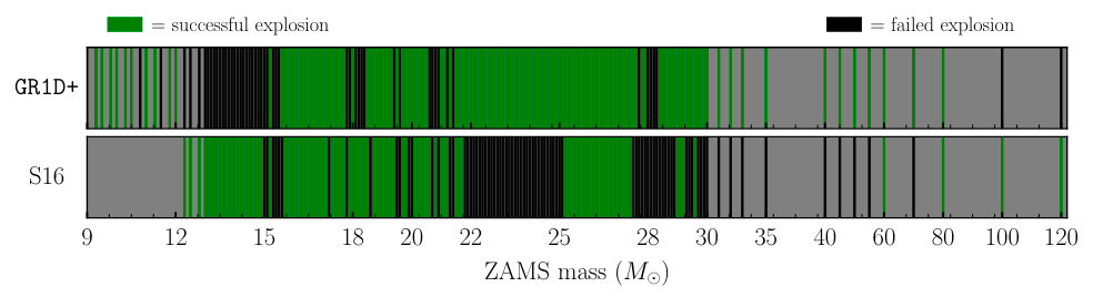 Até pouco tempo atrás, astrônomos acreditavam que a explodabilidade de uma estrela era determinada apenas por sua massa — as estrelas com massa maior que 20 vezes a massa do Sol colapsariam para formar um buraco negro, e estrelas mais massivas que 8 massas solares explodiram como supernovas. Entretanto, a relação massa inicial e a forma que se dá a “morte” da estrela parece ser bem mais complexa: há diversas regiões (no intervalo de massas inicias) em que uma estrela poderia explodir ou não. Na Figura 1, diferentes autores encontram diferentes locais para essas “ilhas de explodabilidade” uma vez que elas são bastante dependentes dos modelos de evolução estelar usados para o cálculo. Portanto, saber ao certo o destino final da estrela dadas a massa inicial e metalicidade é bastante desafiador. Porém, os autores do dia definem um critério de explodabilidade que depende do quanto o núcleo estelar está “compactado” e da posição da interface entre as camadas de silício e oxigênio no mesmo.