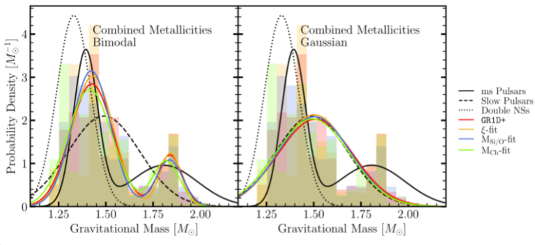Na Figura 3 os autores fazem exatamente isso ao comparar as massas observadas de estrelas de nêutrons com as previsões resultantes de suas simulações de estrelas que explodem de acordo com seus critérios. O estudo testa diferentes métodos para prever a massa de estrelas de nêutrons e nele os autores encontram que os dados são melhores ajustados por uma função por partes baseada no quão compactado está o núcleo pouco antes de seu colapso (linha amarela). Todos os métodos no entanto se ajustam melhor aos dados observados quando se supõe uma distribuição bimodal — i.e., a distribuição do número de estrelas de nêutrons com a massa tem dois picos. Curiosamente também observamos esse mesmo tipo de distribuição de massa quando a medimos através de pulsares com o mesmo padrão de picos.
