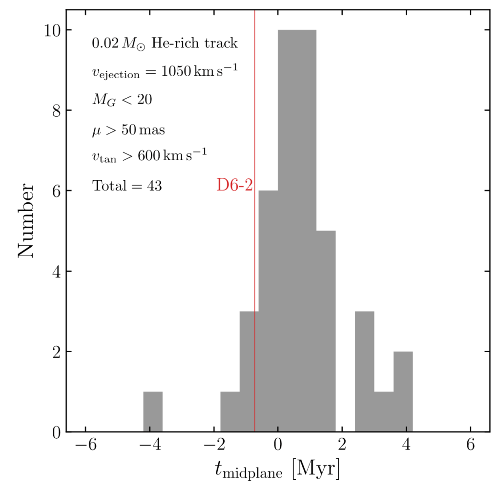 Com base nessas simulações, estimou-se que ~2% das SNe Ia podem resultar em uma estrela hiperveloz rica em hélio como D6-2 (ver Figura 1). Se considerarmos sobreviventes ricos em C/O (como os primos de D6-2, D6-1 e D6-3), a taxa cai para ~0,2%, o que é, curiosamente, um valor próximo à taxa estimada de eventos semelhantes a SN 2003fg, que são SNe Ia excepcionalmente brilhantes e de evolução lenta, frequentemente exibindo sinais de carbono e oxigênio não queimados em seus espectros.