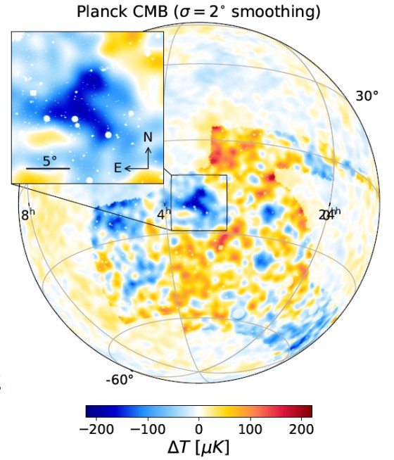 O cold spot é um padrão na CMB que intriga cosmólogos por anos. No artigo de hoje, os autores usaram lenteamento gravitacional para encontrar pelo menos parte da causa: um supervoid gigante que se estende em 1.8 bilhões de anos luz!